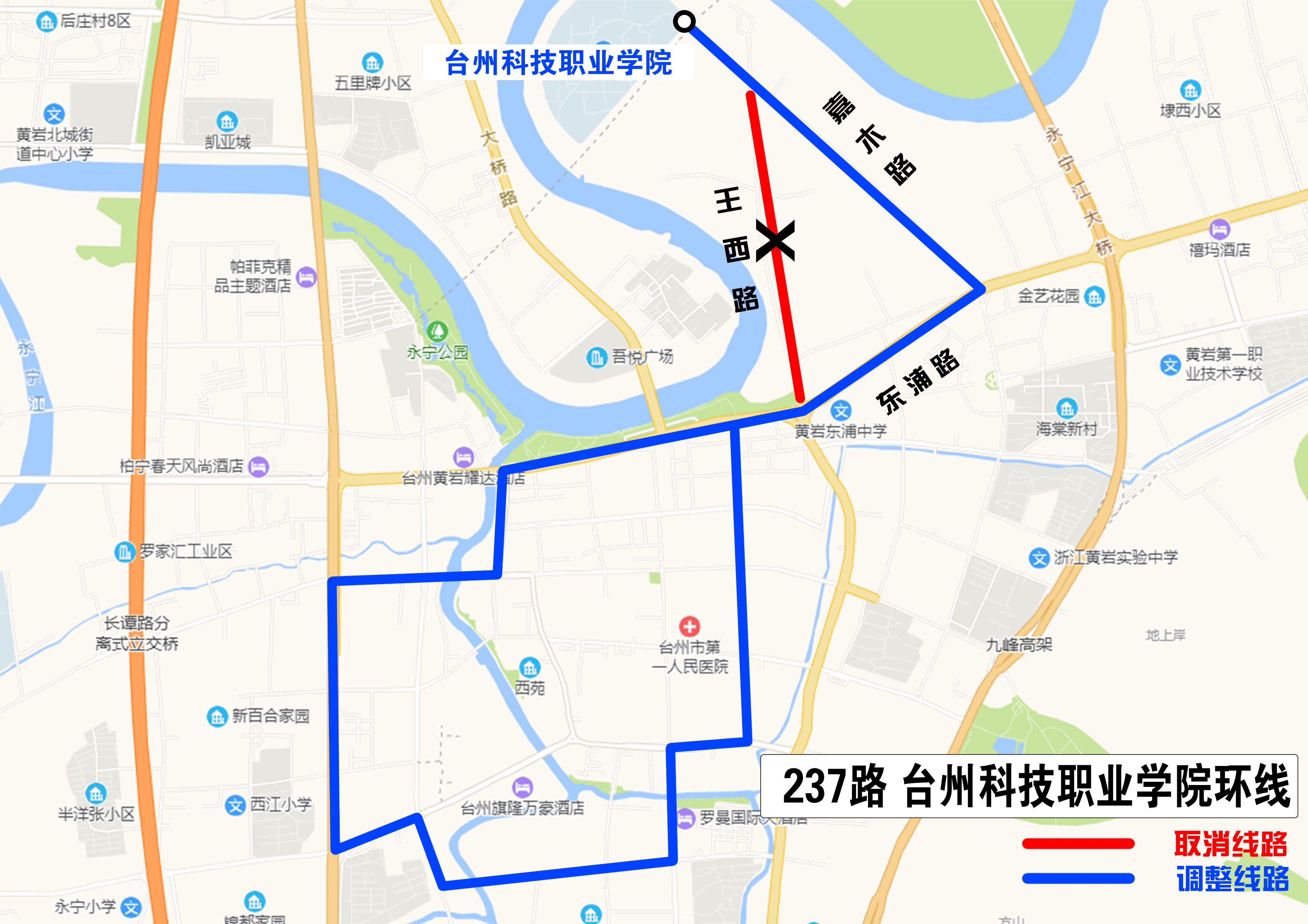 因黃巖東浦中學(xué)遷建工程施工需要,王西路大型車輛無法通行。自2020年5月12日起,237路公交線將取消王西路,改道至嘉木路運營,改道期間取消王西菜場、王西排污站、黃椒路西口等站點,同時新增王東村、東浦中學(xué)站點,請廣大市民就近選擇換乘。