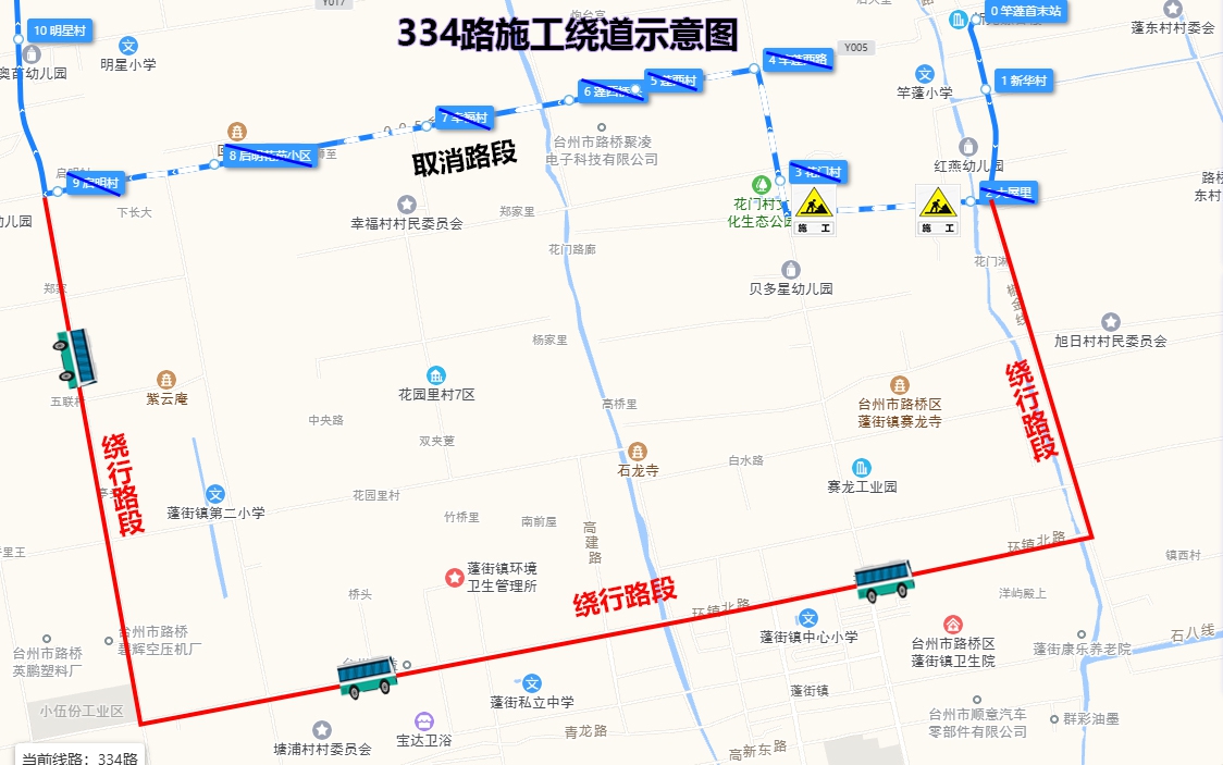 為配合花門村至大屋里道路封閉施工需要,即日起334路由中心街臨時(shí)繞道環(huán)鎮(zhèn)北路至椒金線(竿蓬首末站),不再途經(jīng)005鄉(xiāng)道。
