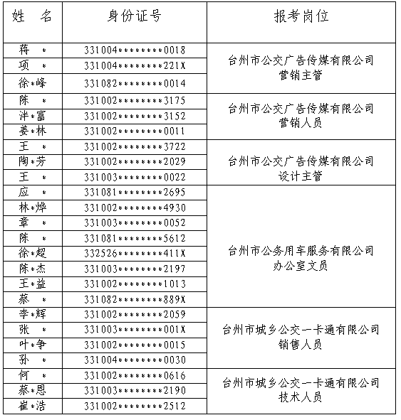 根據《臺州市公共交通集團有限公司關于下屬子公司公開招聘工作人員的公告》及各職位報名情況,下屬競爭性子公司中的臺州市城鄉(xiāng)公交一卡通有限公司銷售人員崗位因報名人數不足,報經集團審核后同意該崗位招聘人數核減至1名。現經組織招聘資格審查,下列報名人員通過資格審核,擬進入下一招聘程序。具體名單及考試安排如下: