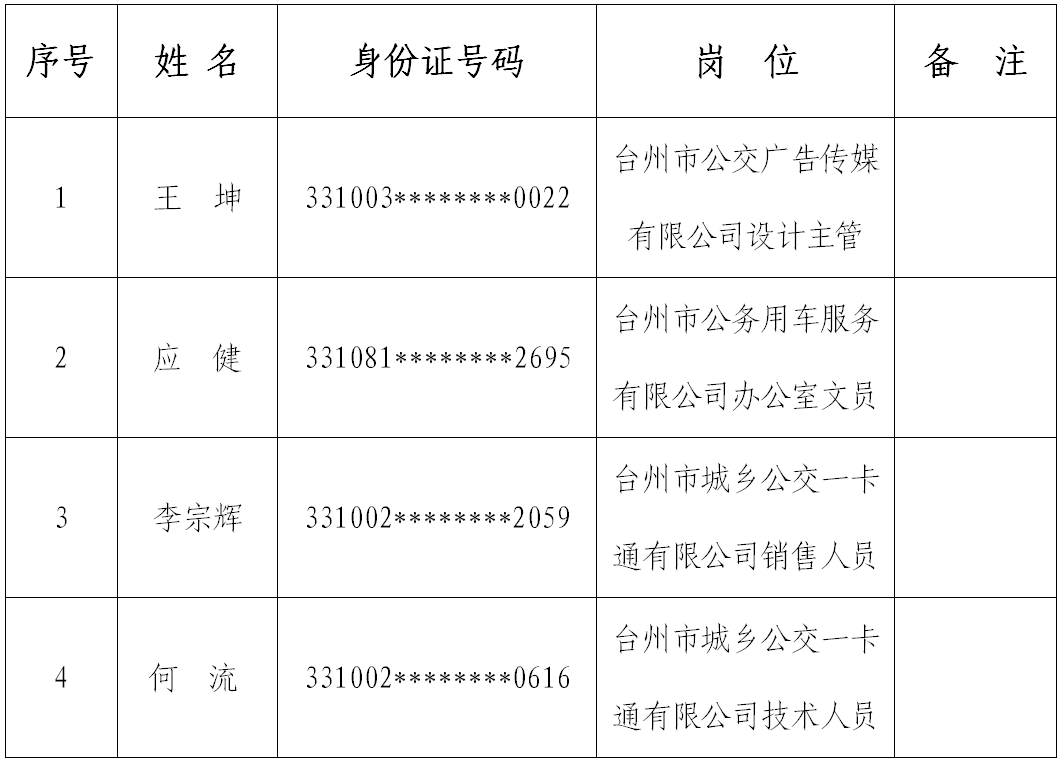 根據(jù)臺(tái)州市公共交通集團(tuán)有限公司下屬競爭性子公司關(guān)于公開招聘工作人員公告的相關(guān)規(guī)定,經(jīng)公開報(bào)名、面試、體檢和考察等程序,除臺(tái)州市公交廣告?zhèn)髅接邢薰緺I銷主管、營銷人員崗位進(jìn)入體檢人員放棄體檢外,確定以下人員為擬聘用人員,現(xiàn)公示如下: